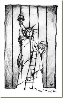 Nem oly' rég felkértek egy könyv illusztrálására. Egy hölgyről szólt a történet, aki turistavizummal kiutazott az Egyesült Államokba ahol illegálisan munkát vállalt. Megpályázta a zöld kártyát is, mert hosszú távon képzelte el a kinntartozkodást. Megismekedett valakivel, aki néhány napra elvitte Hawaira ám mikor visszatértek, elkapták, őrizetbe vették és kiutasították. Már itthon érte az értesítés, hogy a zöld kártyát megkapta. Igazi mai történet. Jómagam is találkoztam hasonló sorsokkal. Meséltek olyan sztorit, hogy egyik magyar feljelentette a másikat valami tartozás miatt akit azután az éjszaka közepén csak úgy pizsamában toloncoltak ki. A mellékelt rajzot kulcsfontosságúnak tartottam. Nem így a szerző vagy a kiadó. Talán azért, mert ha nem olvassák el a könyvet a kép mást sugal? Mivel a könyvben nem jelenhetett meg, így teszem közzé.